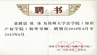 2018年5月公司陳浩總經(jīng)理被鄭州大學(xué)法學(xué)院(知識(shí)產(chǎn)權(quán)學(xué)院)聘為校外導(dǎo)師。