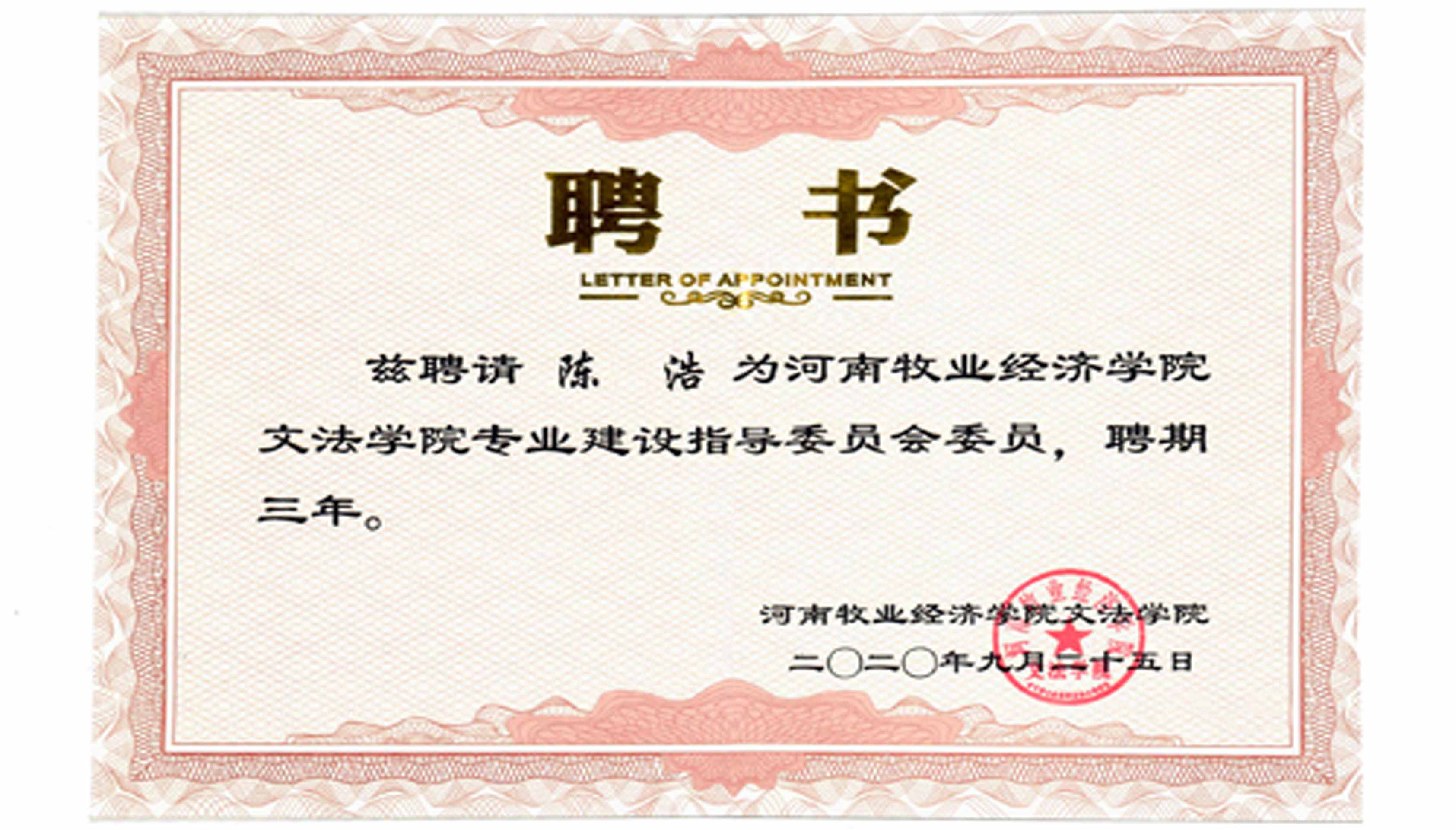 2020年9月公司總經(jīng)理陳浩被河南牧業(yè)經(jīng)濟(jì)學(xué)院(文法學(xué)院)聘為專(zhuān)業(yè)建設(shè)指導(dǎo)委員會(huì)會(huì)員。