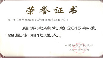 2016年3月公司陳浩總經(jīng)理被評(píng)為“2016年度四星專利代理人”。 -