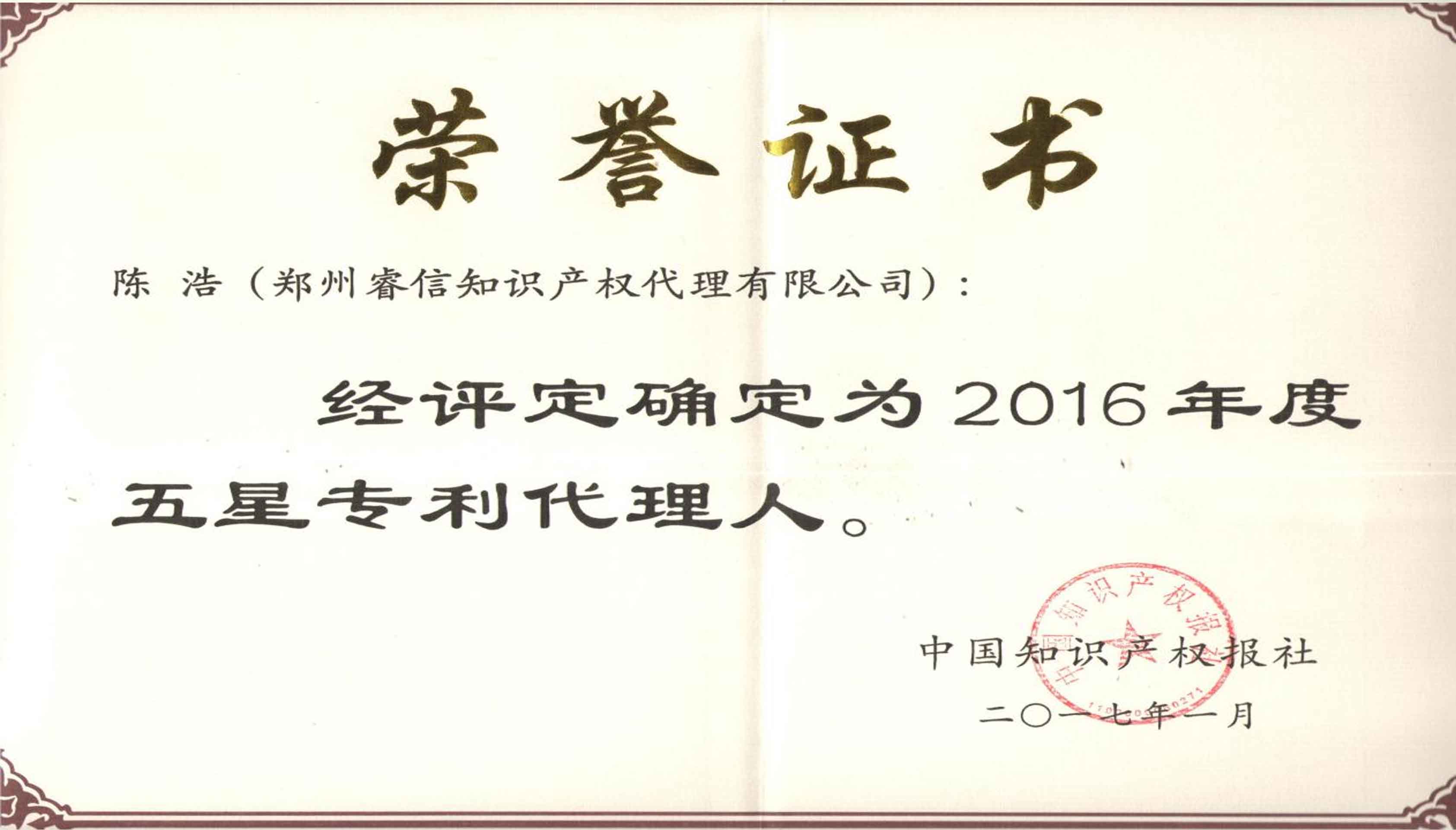 2017年1月公司陳浩總經(jīng)理被評(píng)為“2016年度五星專利代理人”。 -