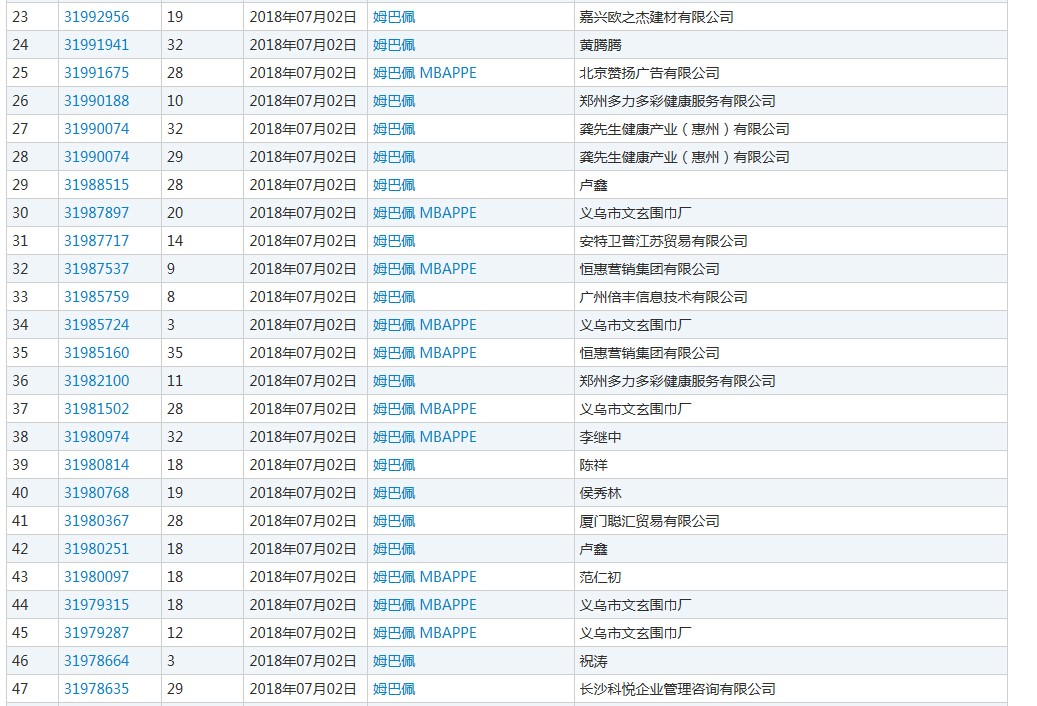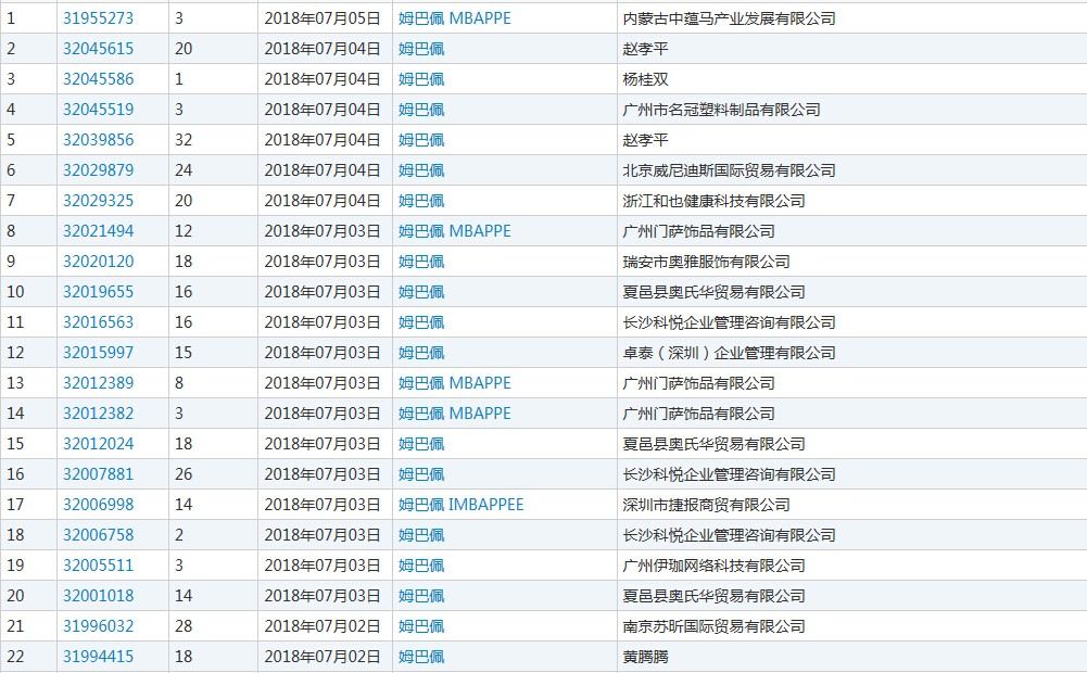 在本屆世界杯開賽后,隨著姆巴佩的天賦與才華開始綻放,申請“姆巴佩”這一商標的人數(shù)又迎來了井噴式的增長,短短數(shù)日,就有八十多個關于“姆巴佩”的新申請。
